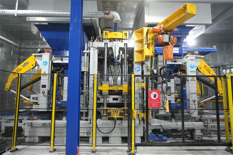 Kärnutrustningen i produktionslinjen använder ZN1500-2C blockformningsmaskin som nyligen utvecklats av QGM, som integrerar ett antal patenterade teknologier. Utrustningen är utrustad med ett intelligent snabbt formbytessystem, som snabbt kan växla till att producera diversifierade produkter som trottoartegel och permeabla tegelstenar; Baserat på den industriella internetplattformen, realiserar den realtidsövervakning och intelligent analys av produktionsdata, förkortar svarstiden för utrustningsfelsvarning med 60 % och förbättrar drift- och underhållseffektiviteten avsevärt.