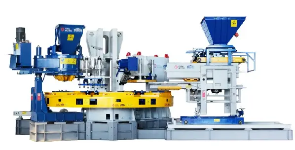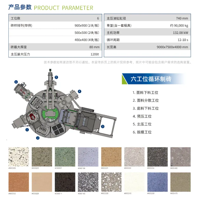 HP-1200T statisk roterande bordspress separerar kreativt tegeltillverkningsprocessen i 7 stationer, arrangerade i en cirkulär layout, vilket minskar golvytan, och har en stor gjutarea och gjuthöjdsområde, vilket säkerställer att kundernas olika krav på imiterade betongblockprodukter av sten uppfylls, vilket fyller tomrummet i hushållsmaskiner för imitation av roterande tegelstenar med sju stationer. Dess formulerade gruppstandard "T/CCMA 0125-2022 Rotary Multi-station Static Press Concrete Block Forming Machine" har valts ut som ett av de 100 gruppstandardapplikationsdemonstrationsprojekten av ministeriet för industri och informationsteknologi 2023.